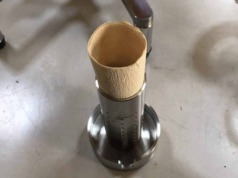 ③筒状のコーヒーフィルターをシリンダーの中に入れます。