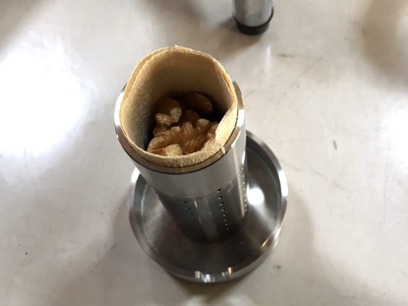 クルミ油搾りました。クルミはとても柔らかくて、油がたくさんあります。 今回はコーヒーフィルターを1枚使用していますが、それでも中身が飛び出してくる場合は、枚数を増やして厚みを増すなどして搾ってみられてください。