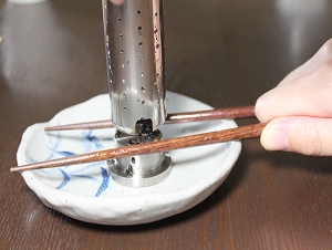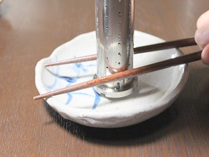 その際、画像のようにお箸などでシリンダーベースを抑えてやると、手に油が付きづらくなります。