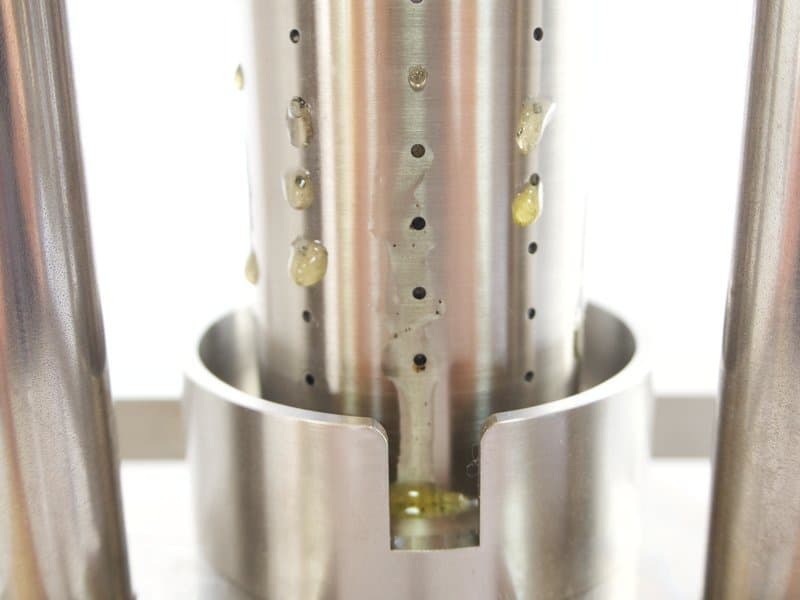 フィルターをシリンダーにセットします。お茶の実は柔らかいので、フィルター無しで搾った場合、シリンダーの穴から実が飛び出してくることが良くあります。搾る際には、フィルターを使用されることをお勧めします。フィルターは市販のコーヒーフィルターでも使用出来ますが、弊社で販売している圧搾袋を切って使うと、強度もあってちょうど良いとのお声を頂いております。